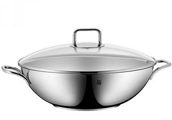 High quality stainless Steel wok 32 cm in diameter. Glass lid. Suitable for all types of stove, including induction.