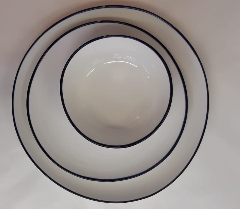 White porcelain dining set with blue stripe. Asymmetrical plates and young and contemporary design.